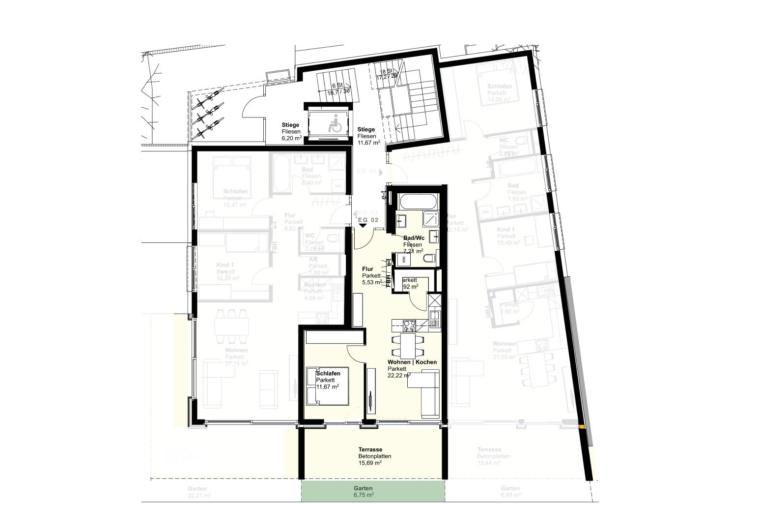 Allen Wohneinheiten ist ein Tief- bzw. Garagenplatz (nicht im Kaufpreis inkludiert) zugewiesen. Für Besucher stehen 4 Freistellplätze zur Verfügung. In unmittelbarer Nähe befindet sich ein öffentlicher Spielplatz.