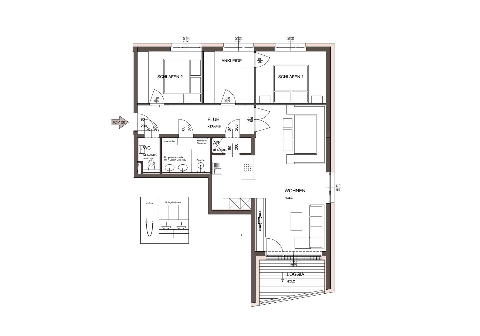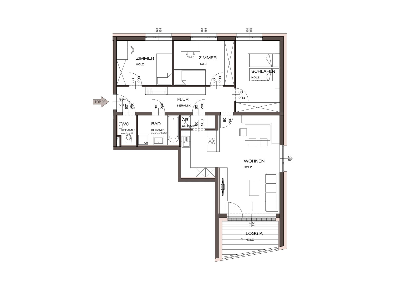 Die 4-Zimmer-Wohnung Top B28 kann, nach Absprache, auch in eine 3-Zimmer-Wohnung mit begehbaren Schrankraum transformiert werden. Das Wohnzimmer kann vergrößert werden. Für das Bad steht eine Variante mit Badewanne und eine Variante mit begehbarer Dusche zur Verfügung. Gerne gehen wir auf Ihre Wünsche individuell ein.