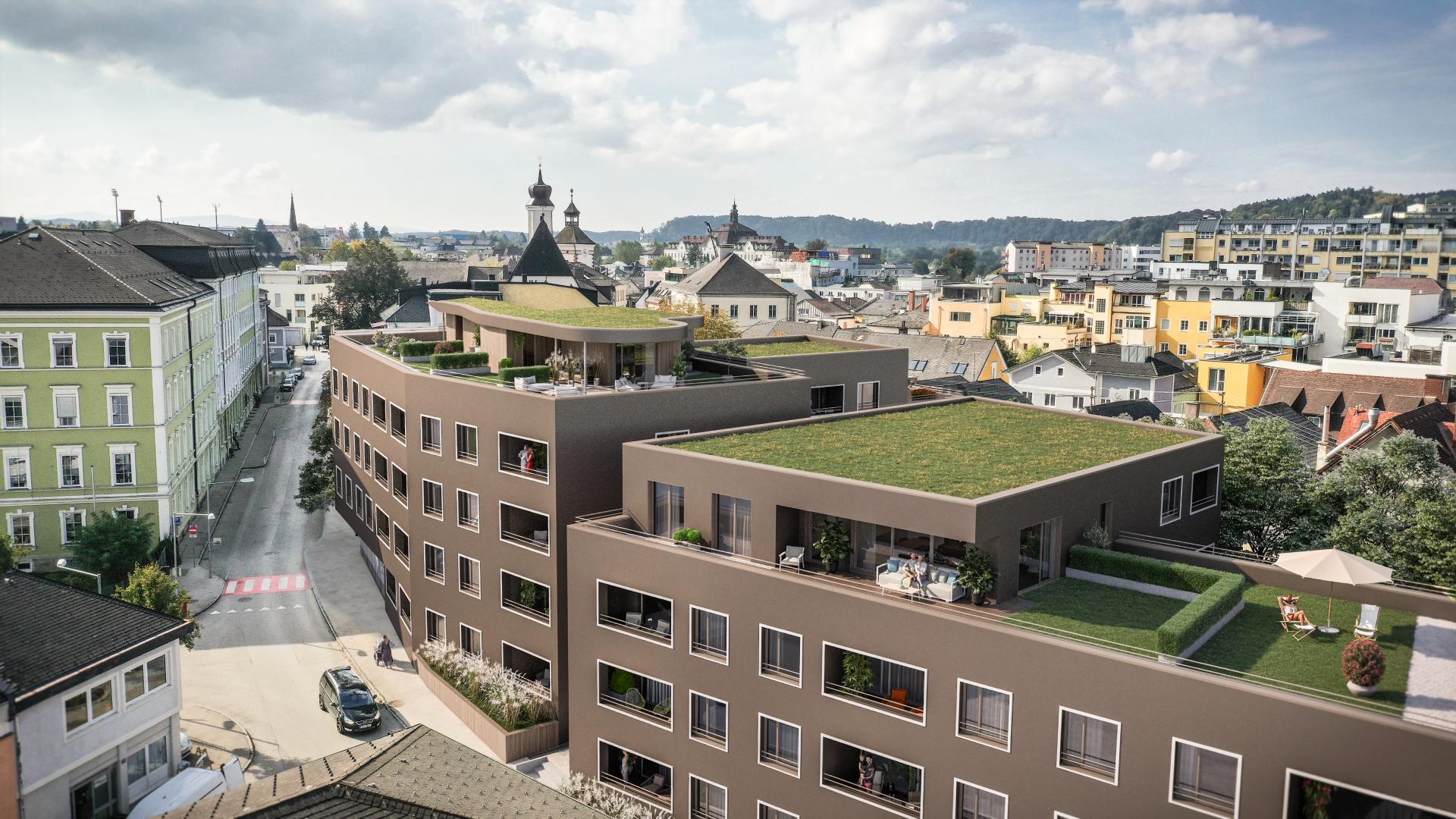Ein echtes Highlight der Anlage stellen die Penthouse-Wohnungen dar, die neben geräumigen Loggien teilweise auch über begrünte Dachgärten und Dachterrassen verfügen. Ein herrlicher Ausblick über die Dächer von Vöcklabruck wird geboten!