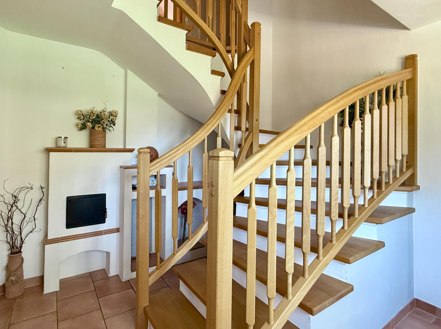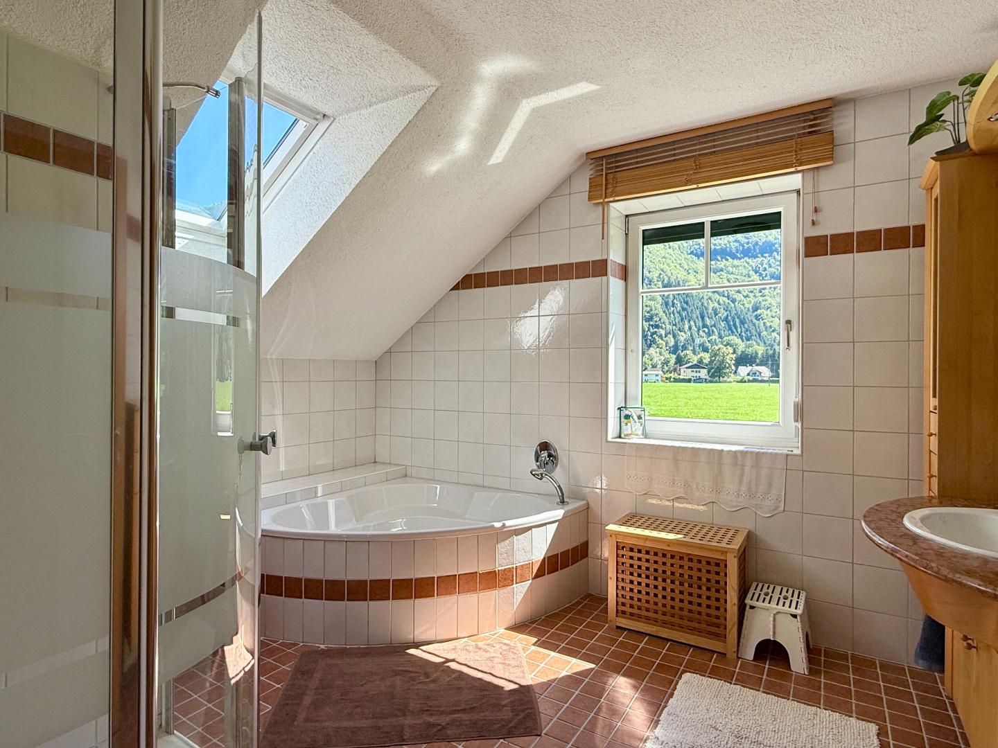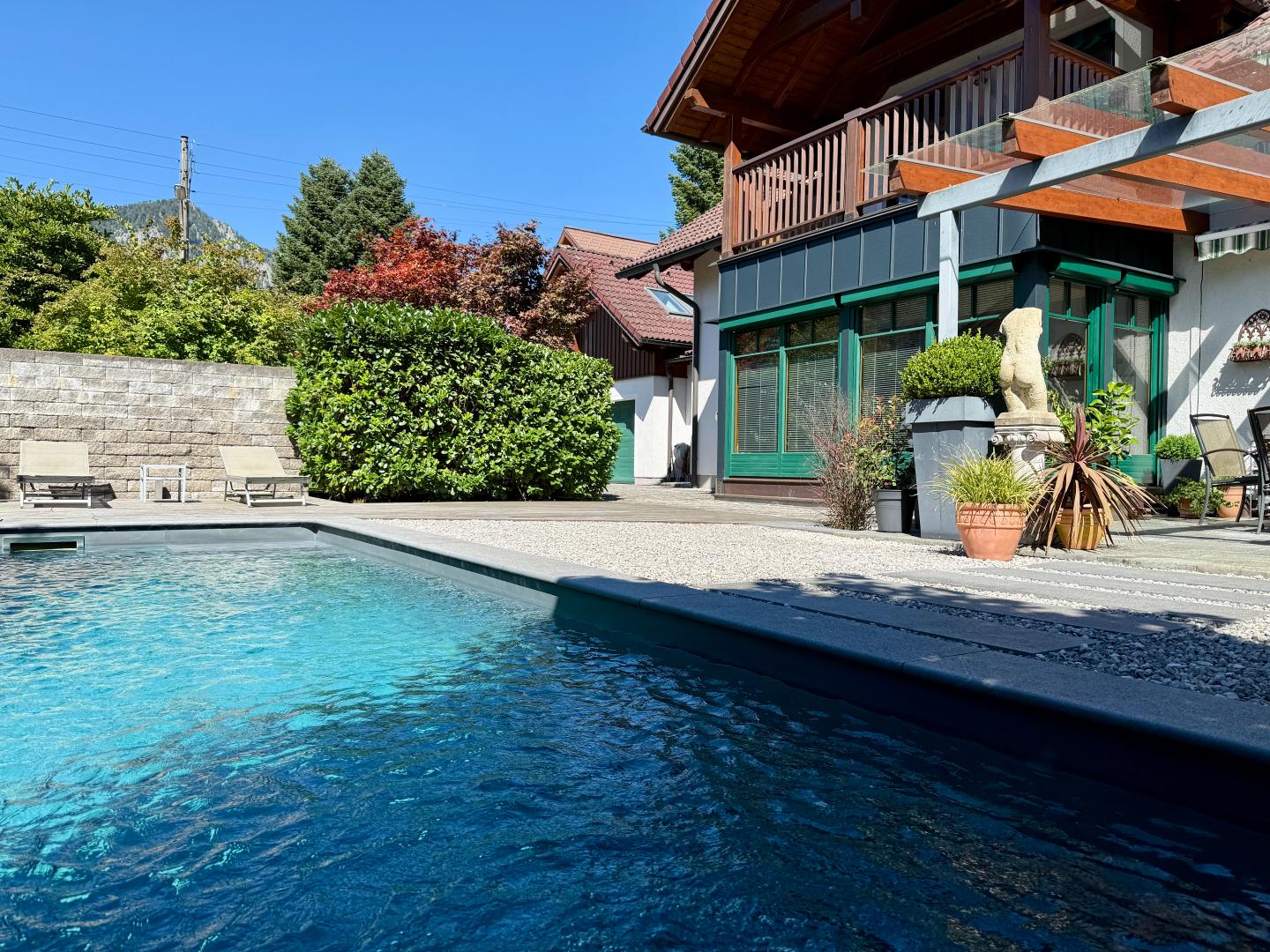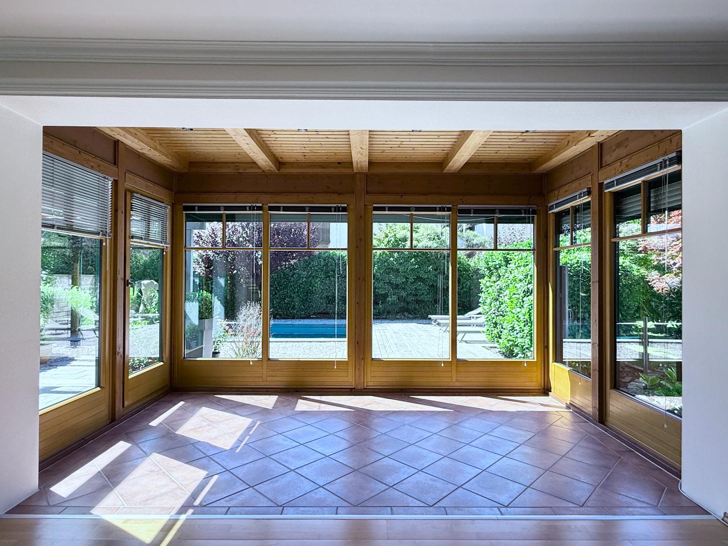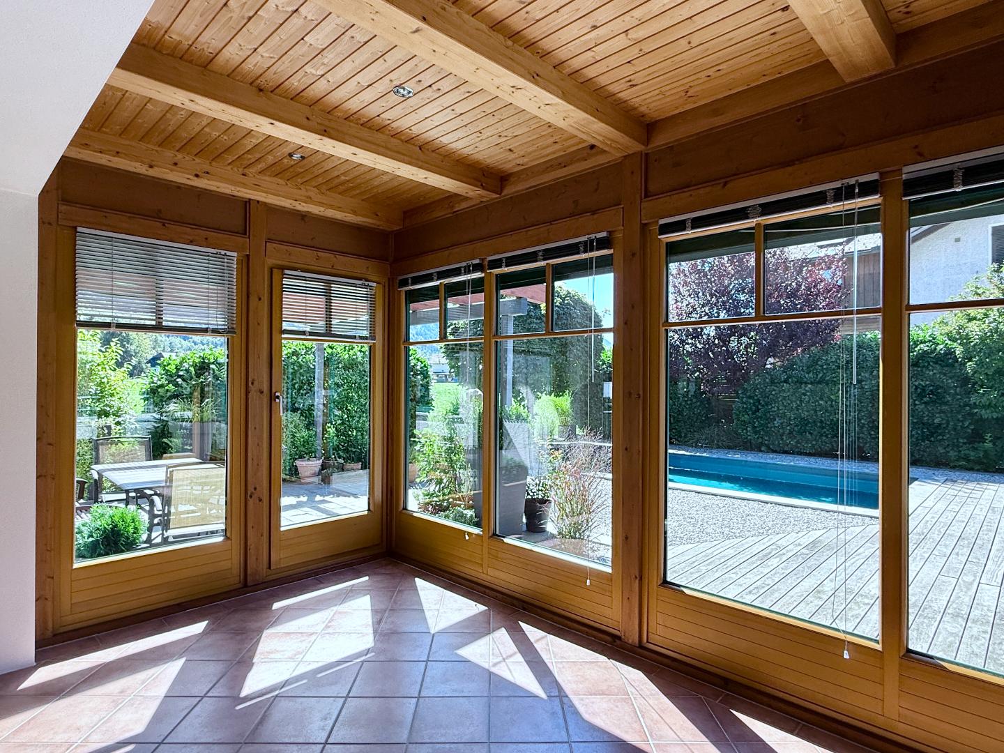 Helle und großzügig geschnittene Wohnräume, ein offener Wohn- und Essbereich mit Kachelofen, ein Wintergarten mit direktem Zugang zur Terrasse, Garten und „Bio“ Pool sind ideal Voraussetzungen zum wohlfühlen. Die Immobilie verfügt über 3 gut geschnittene Schlafzimmer, darunter ein Elternschlafzimmer mit begehbarem Schrankraum, ein Badezimmer im Obergeschoss mit Eckbadewanne und Dusche sowie ein zusätzliches Gäste-WC im Erdgeschoss. Über der Doppelgarage wurde ein ca. 40 m² großer Raum geschaffen welcher z.B. als Fitness-, Entspannung-, Bibliothek- oder Büroraum genutzt werden kann. Die Doppelgarage und die Werkstatt haben direktem Zugang zum Haus.