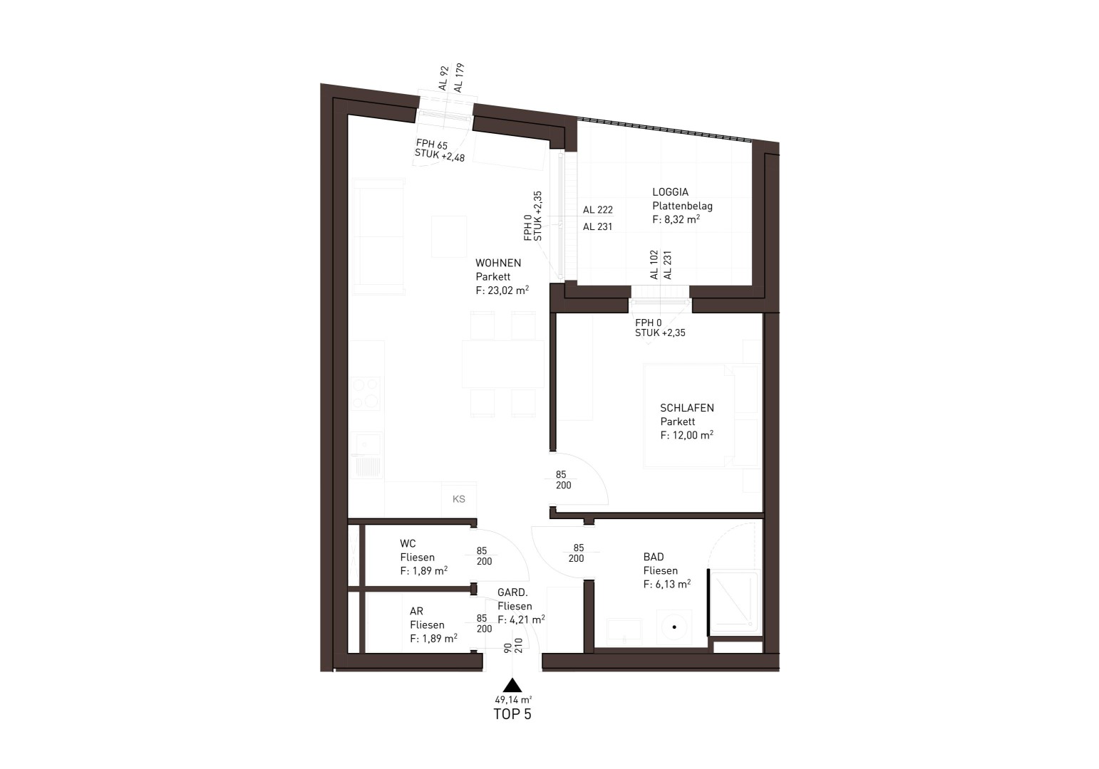 Der GRUNDRISS der provisonsfreien 2-Zimmer-Wohnung Top 5 befindet sich im Baukörper 2 (vorderer Baukörper) im 1. OG und ist mit einer Loggia ausgestattet. Die sehr gut aufgeteilte und helle Wohnung bietet Ihnen viel Platz und ein sehr schönes Wohnzimmer mit offener Wohnküche. Anschließend an das Wohnzimmer und das Schlafzimmer befindet sich die Loggia mit ca. 8,32 m².