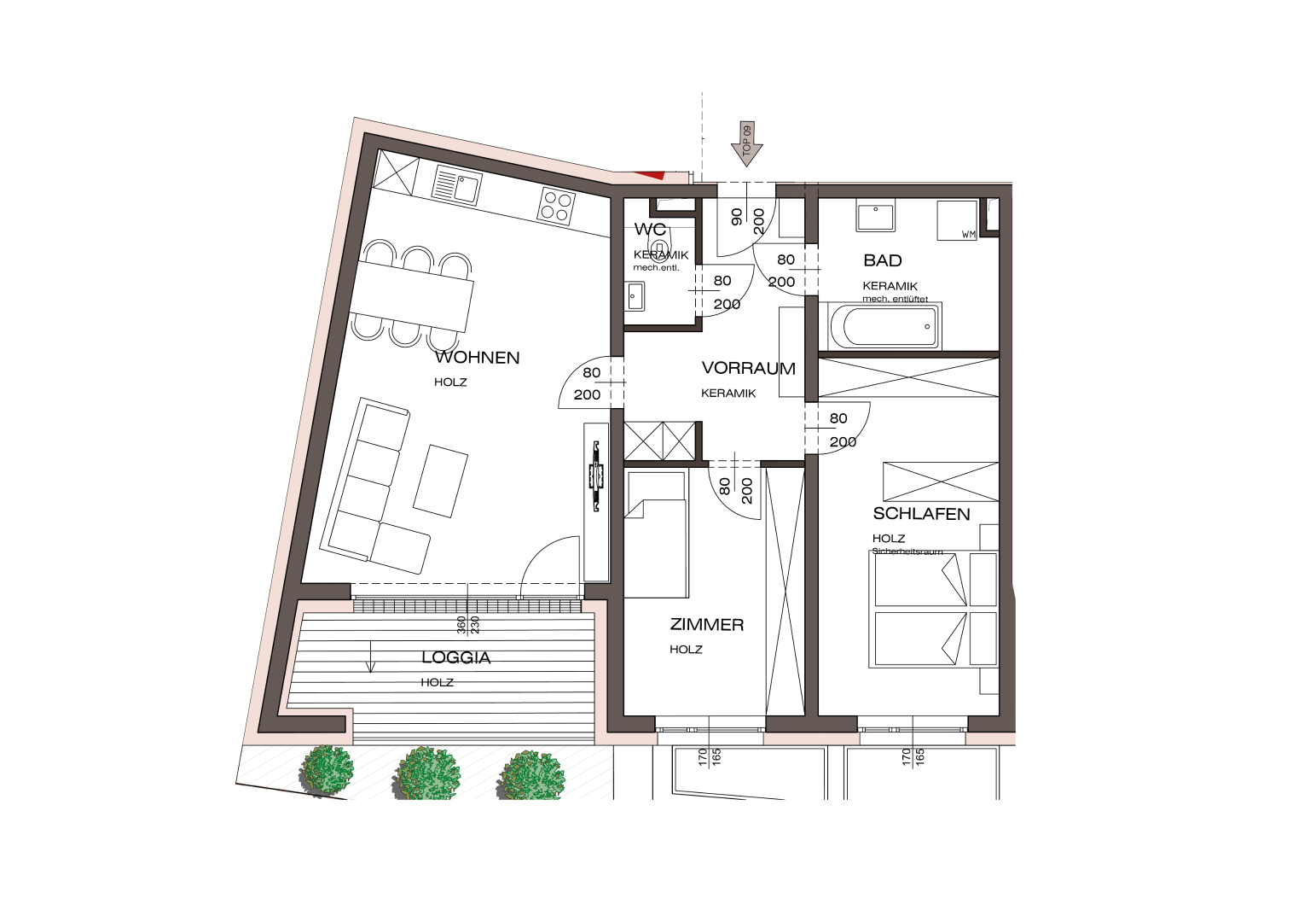 Die ca. 69 m² große 3-Zimmer-Wohnung befindet sich im Erdgeschoss und bietet einen modernen Grundriss für flexible Gestaltungsvarianten. Ein großzügiger Vorraum, ein großes Schlafzimmer und ein gemütliches Wohnzimmer mit anschließender Loggia bieten ausreichend Platzangebot.