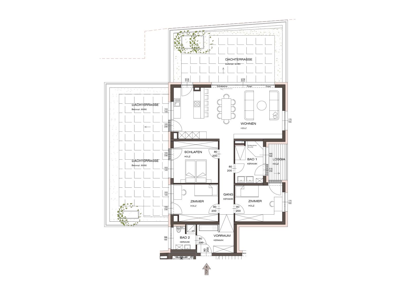Der GRUNDRISS dieser besonderen 4-Zimmer-Wohnung A34 befindet sich im Dachgeschoss von Baukörper A. Die helle Wohnung verfügt über ein ca. 40 m² großes Wohnzimmer mit 2 anschließenden nach Süd-West ausgerichteten Dachterrassen mit insg. ca. 98 m²! Die großzügige Raumaufteilung bietet viele Gestaltungsvarianten. Ein weiteres Highlight ist die ans Bad angrenzende Loggia. Das Bad ist mit einer Dusche und einer Eckbadewanne ausgestattet. Die zentrale Lage und Ausstattung erfüllt jegliche Anforderungen für alle Generationen.