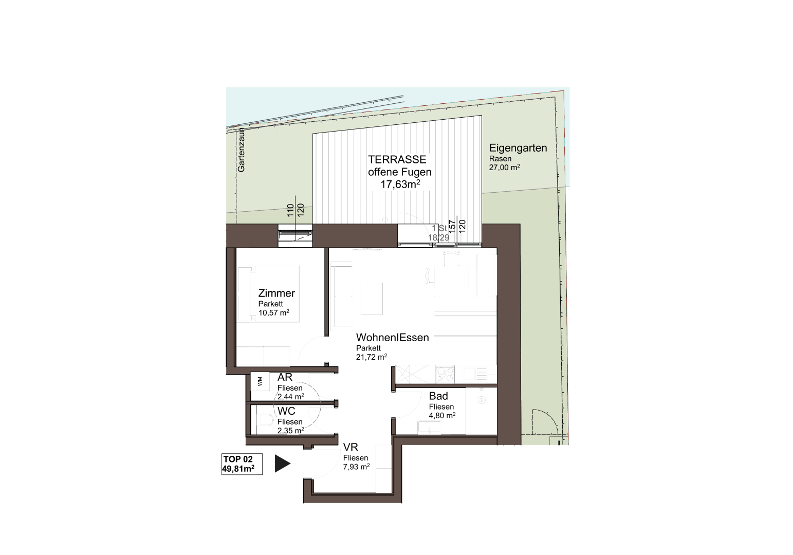 Die ca. 50 m² große Wohnung Top 2 ist im Gartengeschoss situiert. Die Immobilie bietet einen strukturierte Aufteilung, verfügt über 2-Zimmer, ein Bad mit einer Dusche, eine separate Toilette und einen Abstellraum. Anschließend an das Wohnzimmer, mit gemütlichem Wohnküchenbereich und das Schlafzimmer, befindet sich der nach Süd-West ausgerichtete Eigengarten mit vorgelagerter Terrasse.