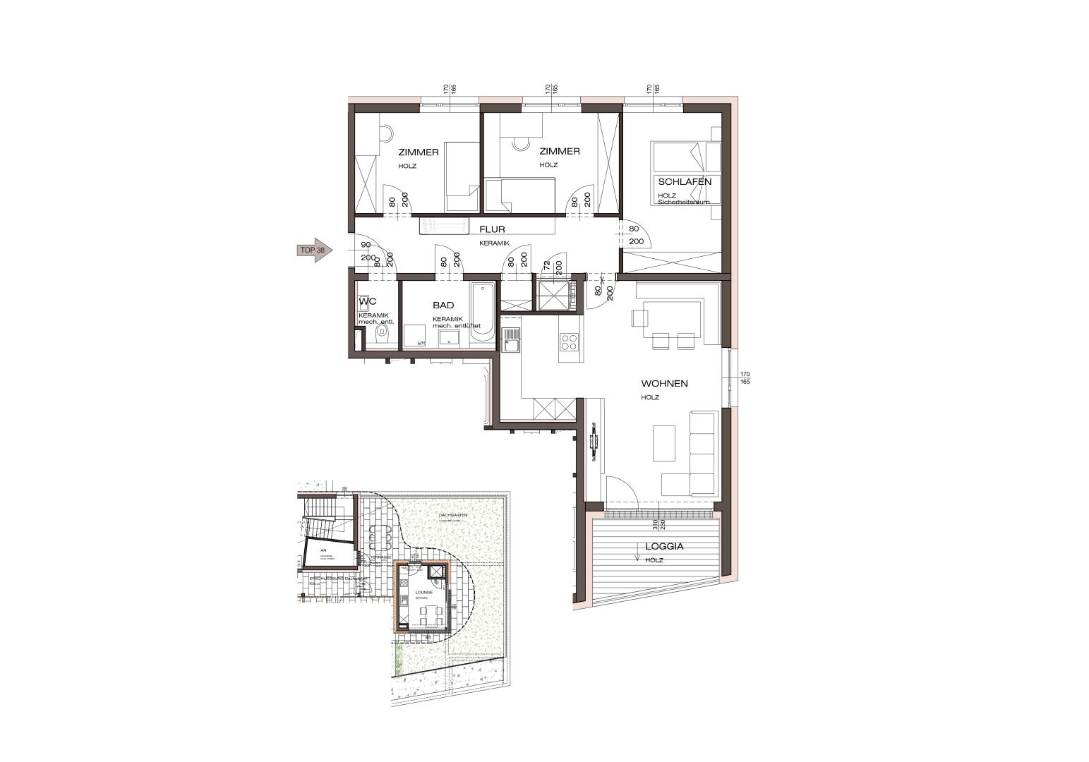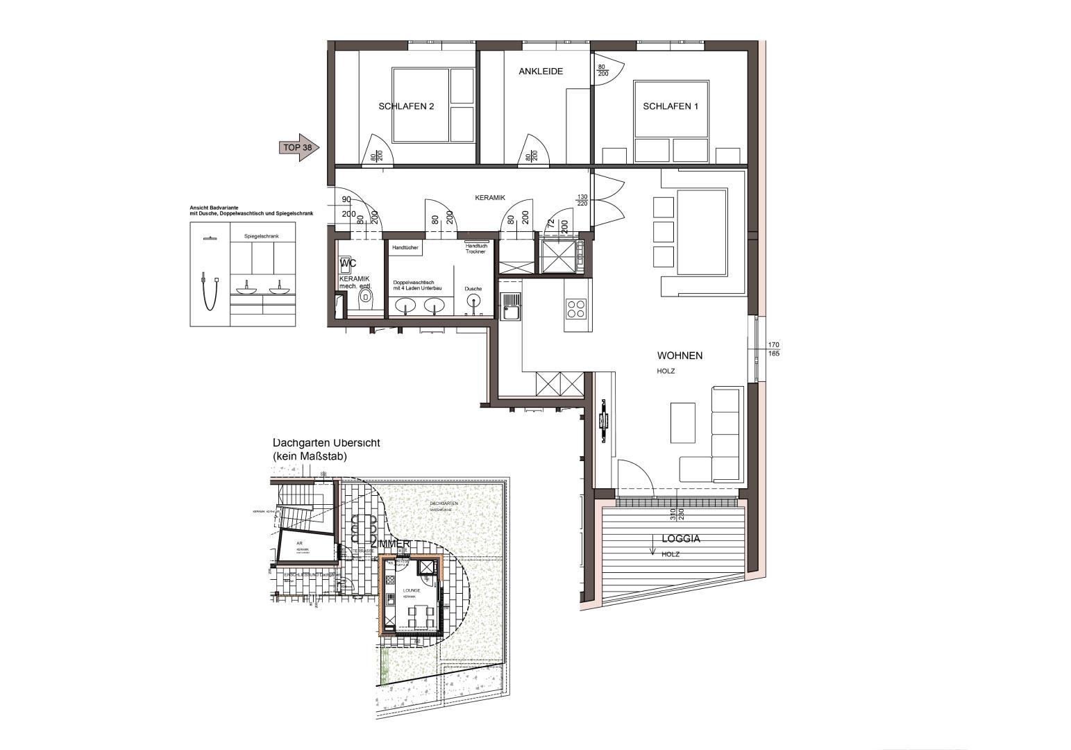 Die 4-Zimmer-Wohnung Top B38 kann auch in eine 3-Zimmer-Wohnung mit begehbaren Schrankraum transformiert werden. Das Wohnzimmer kann vergrößert werden. Für das Bad steht eine Variante mit Badewanne und eine Variante mit begehbarer Dusche zur Verfügung. Gerne gehen wir auf Ihre Wünsche individuell ein.