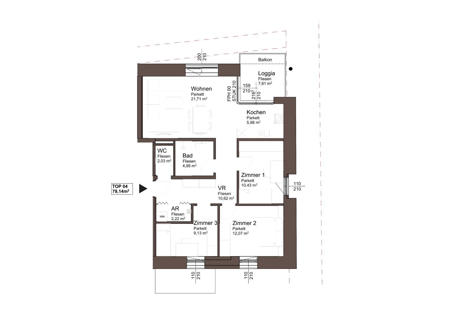 Die ca. 79 m² große Wohnung Top 4 ist im 1. Obergeschoss situiert. Die geräumige Immobilie verfügt über 4 Zimmer – ein Bad mit einer Dusche, eine separate Toilette und einen Abstellraumbereich. Anschließend an das Wohnzimmer mit gemütlichem Wohnküchenbereich befindet sich die nach Süd-West ausgerichtete Loggia / Balkon.