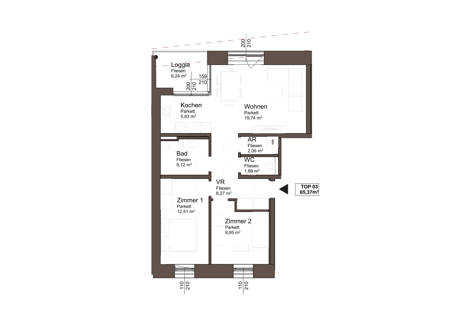 Die ca. 65 m² große Wohnung Top 3 ist im 1. Obergeschoss situiert. Die Immobilie verfügt über 2 Schlafzimmer – ein Bad mit einer Dusche, eine separate Toilette und einen Abstellraum. Anschließend an das Wohnzimmer mit Wohnküche befindet sich die nach Süd-West ausgerichtete Loggia.