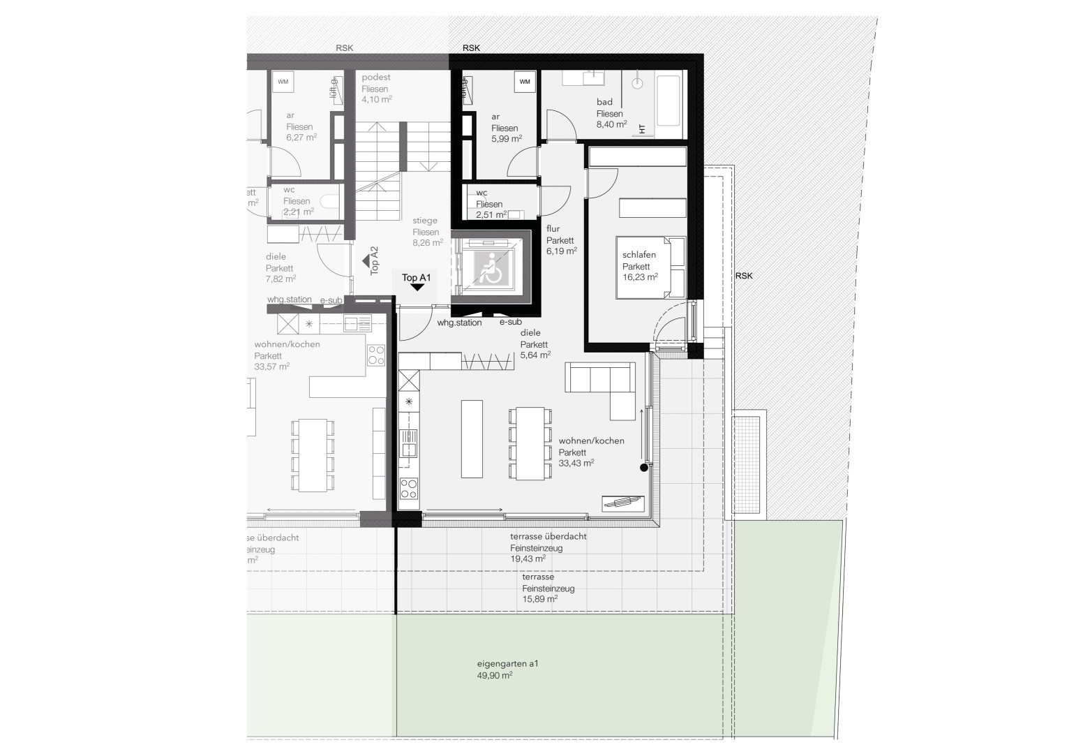Top A2 – 77,95 m² – Terrasse 30,89 m² – Eigengarten 160,08 m² – VERMITTELT