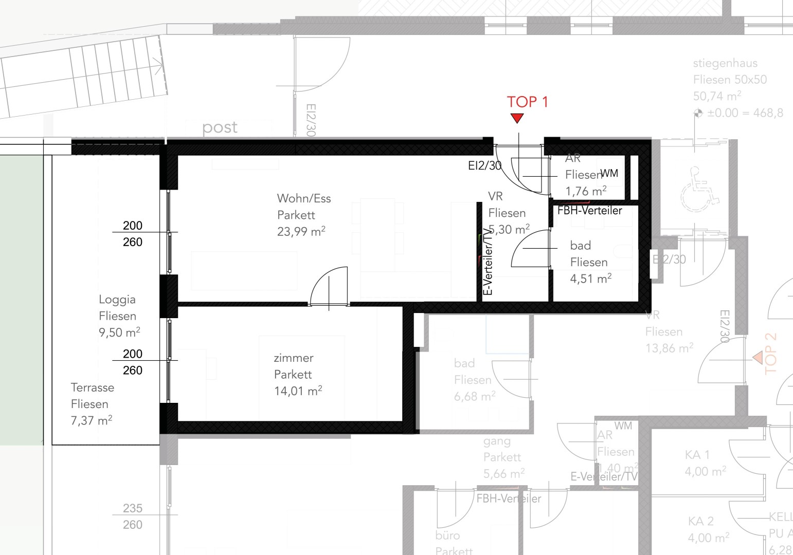 Top 1 – EG – 49,57 m² – Terrasse 7,37 m² – Loggia 9,50 m²